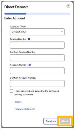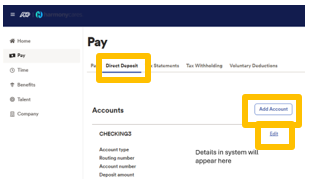 - Click Direct Deposit, then select either Edit or Add Account as needed.