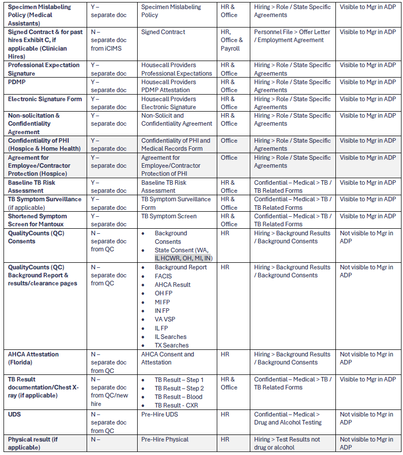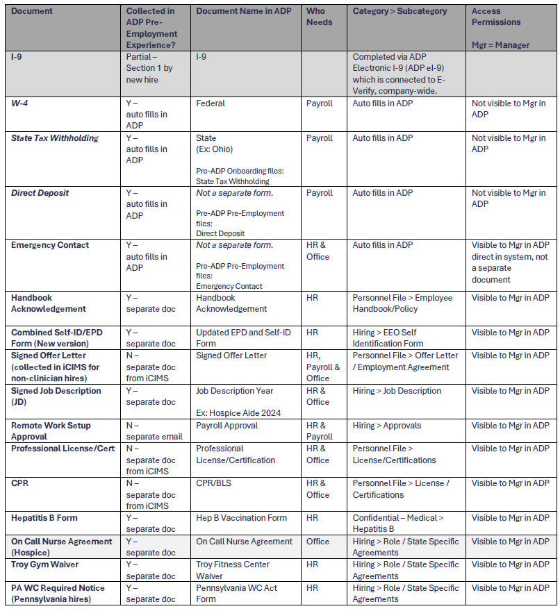 Please follow the table below to categorize the document you are choosing to upload into your ADP Vantage Profile. Access permissions setup in ADP Vantage (MyADP) so that managers, HR and Compliance can access appropriate employee file items as needed. Any employee file questions can be sent to hrmailbox@harmonycares.com for a new hire.