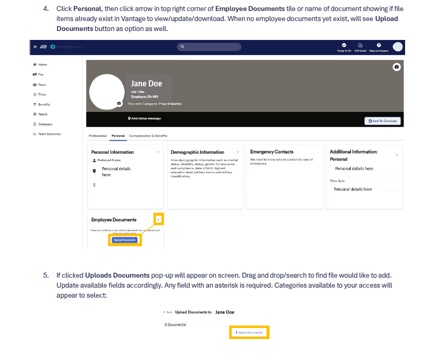 Please follow the steps below to upload documents into an Employee ADP Vantage Profile. Access permissions setup in ADP Vantage (MyADP) so that managers, HR and Compliance can access appropriate employee file items as needed. Any employee file questions can be sent to hrmailbox@harmonycares.com for a new hire