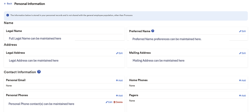 - Personal Information is where legal name, preferred first name, address or personal contact info can be maintained.